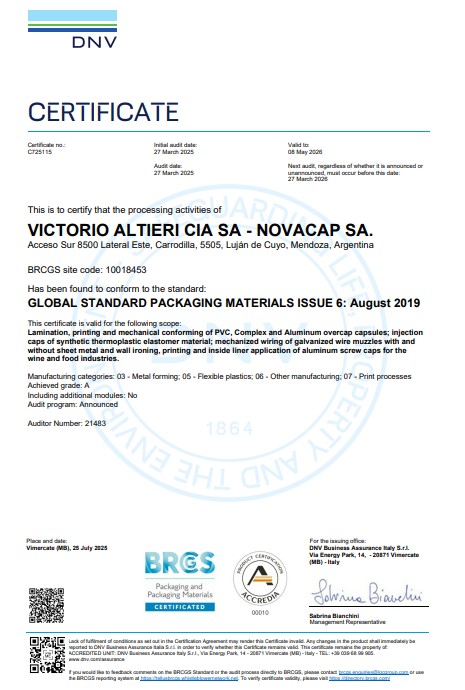 El producto se fabrica de acuerdo con normas con acreditación GFSI y es adecuado para su uso como insumo de sobretaponado y taponado para la industria enológica.