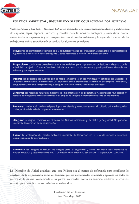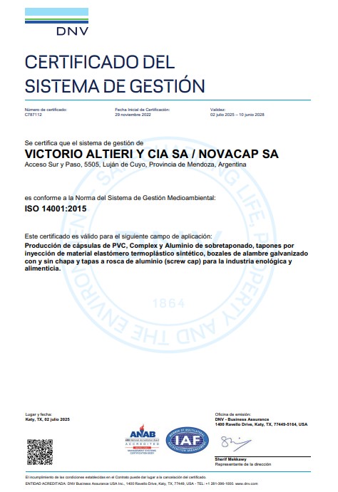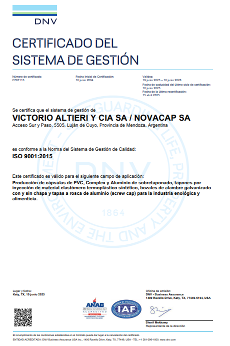 Producción de cápsulas de sobre taponado y de tapones sintéticos, bozales y tapas (screw cap.) para la industria enológica y alimenticia, en su Planta ubicada en Luján de Cuyo, provincia de Mendoza, Argentina.