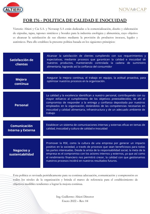 La calidad y la satisfacción de nuestros clientes son un factor clave para el éxito perdurable de nuestra empresa en el mercado, así lo entiende la Dirección de Victorio Altieri y Cia. S.A. Con tal objeto, mantiene un Sistema de Aseguramiento de la Calidad, según Norma ISO 9001/2015.